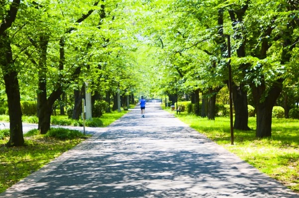 ジョギングコースがない公園や、ジョギングコースでも狭い場所などは、極力1列で走りましょう。