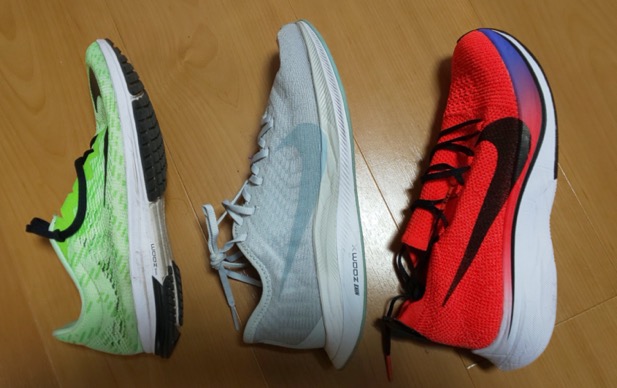 左からStreakLT(クロカン用)・ペガサスターボ(スピード練習用)・ヴェイパーフライ4%(レース用)。