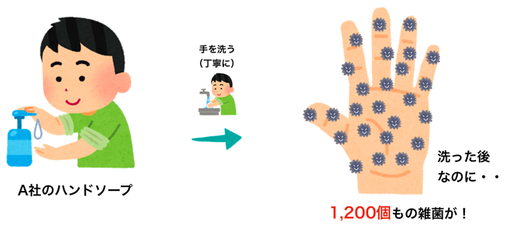 『これはA社から購入したハンドソープなのですが、このハンドソープで丁寧に手を洗った後、手に残った雑菌の数を調べたら1200個もの雑菌が残っていました。』
