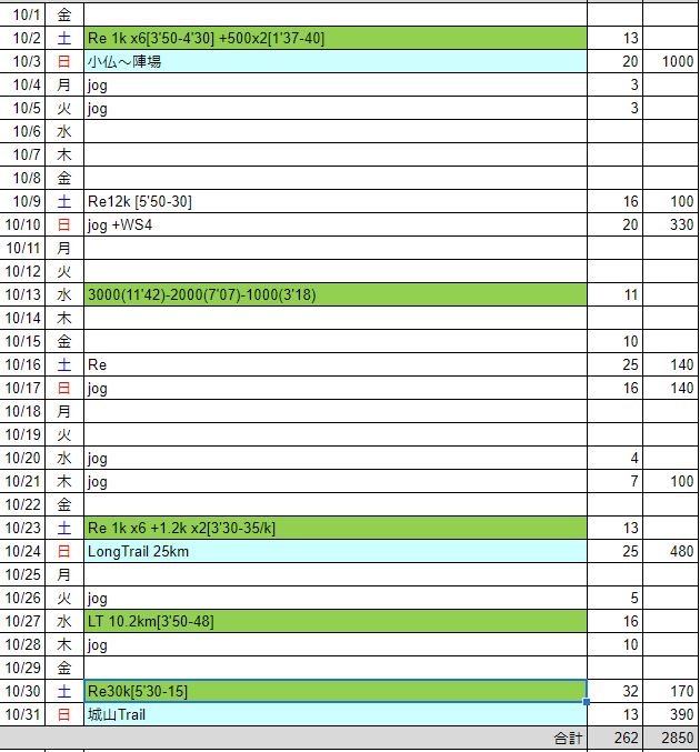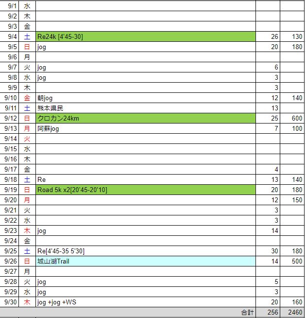 左から、日付・メニュー・走行距離km・獲得標高m の順。