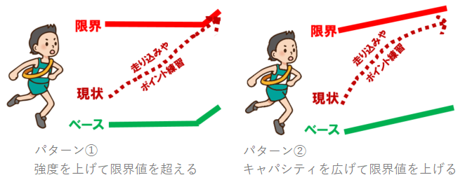 しっかりと身体づくりをして、走るトレーニングの限界値(キャパシティ)をしっかりと広げる準備をしたうえで、走るトレーニングに移行する。